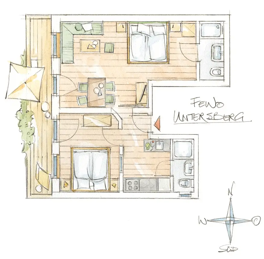 Morgenstund hat Gold im Mund! Mit Blick auf den sagenumwobenen Untersberg liegt diese gut ausgestattete Komfort-Ferienwohnung im ersten Stock auf der Ostseite des Hauses. Die 50 m² große Wohnung für 4 Personen verfügt über zwei Bäder und einen großen Balkon auf der Ostseite des Hauses, der zum Frühstücken in der Morgensonne einlädt.